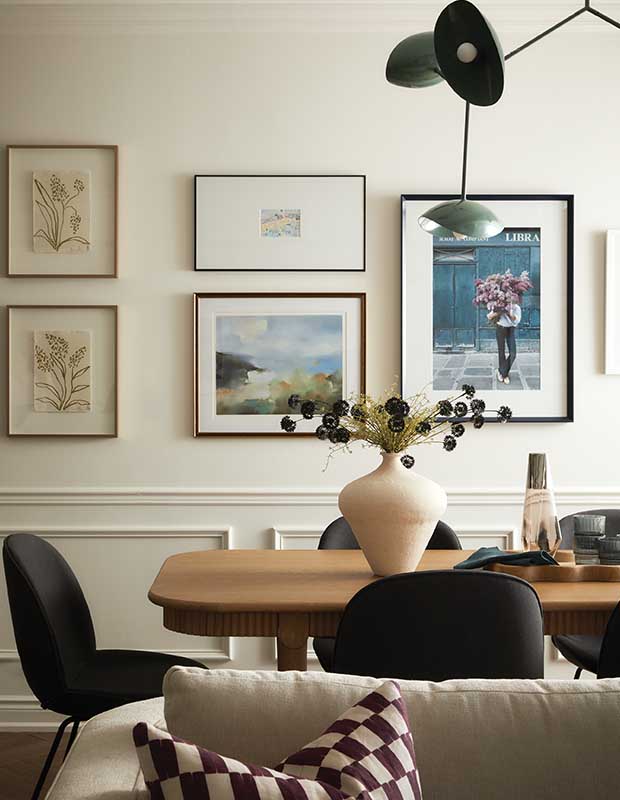 A Parisian-style apartment served as the inspiration for this condo. The dining room has an art gallery effect and surfaced-applied mouldings.