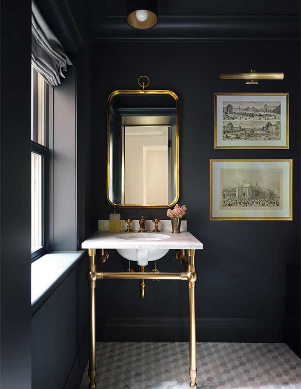 Deep blue-black walls, brass accents, vintage art and a picture light bring the Parisian look home in this pretty powder room.