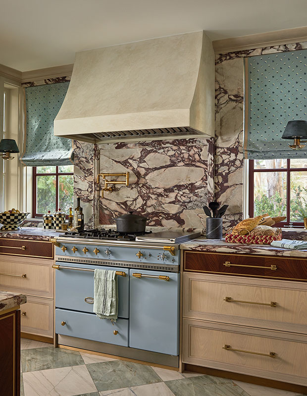 A Venetian plaster vent hood tops above a classic pale blue Lacanche range for a classic pairing.”The owners wanted that trad, old French look, I gravitated toward a Parisian brasserie aesthetic,” says designer Sabrina Albanese.