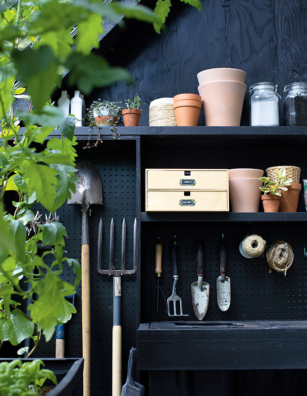 If you haven’t been cleaning and disinfecting pruners and shears after each use to prevent the spread of disease-causing pathogens, fall is an opportunity to wipe off blades to remove soil and dried sap. Disinfect using a 9 parts water to 1 part bleach mixture (TSP or rubbing alcohol works too). In this garage, the pruners and loppers are kept close to the door — handy for cutting evergreen boughs for holiday planters and arrangements!