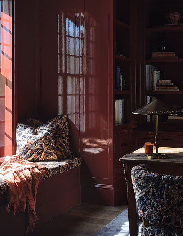 A designer favourite, high-gloss finishes instantly impart glamour. To add even more impact to high-gloss walls, designer Tamara Kaye-Honey painted out all the millwork in this home office to rich effect. “Deep claret in a high-gloss finish and collected vintage pieces reveal our reverence for craft and the art of tension — a space is designed not just for how it looks, but for how it makes one feel. To me, beauty is sensory, soulful and ever so slightly undone.”