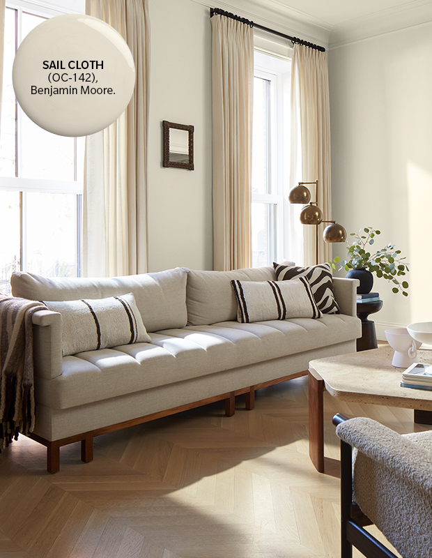 To make rooms feel less stark and more cosy, this white is grounded by a warm beige undertone. In a living room, it works in concert with timeless touches such as burnished metals, warm woods and bouclé.