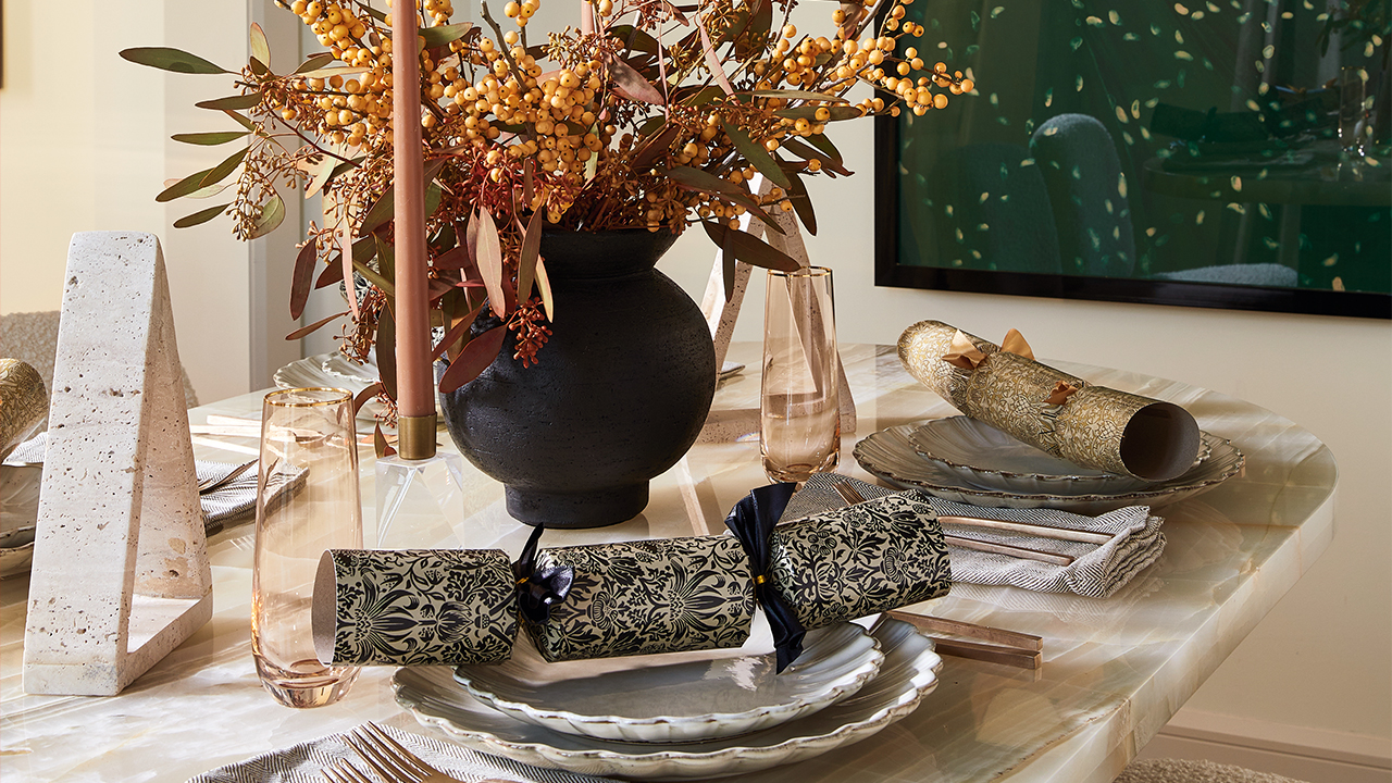 This dining room has a modern look, so it makes sense to buck the traditional red and green scheme in favour of something more subtle. Rust and mustard is the colour palette for florals, candles and glasses to play up the veining of the striking onyx table (left bare to show off the dramatic veining). Limestone triangles evoke holiday trees while the clear candleholders resemble blocks of ice.