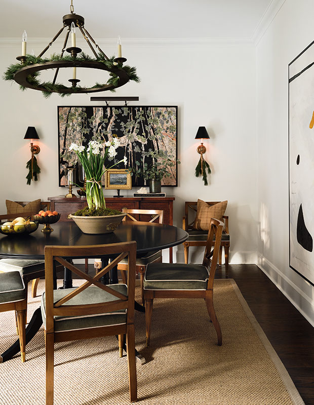 “For me, the holidays are about clementines, natural boughs and greenery that make the house smell wonderful,” says homeowner and designer Cynthia Zamaria. In her magical dining room, she topped the table with fresh pomegranates, dried orange slices and an eclectic mix of candles.
