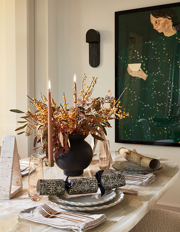 This dining room has a modern look, so it makes sense to buck the traditional red and green scheme in favour of something more subtle. Rust and mustard is the colour palette for florals, candles and glasses to play up the veining of the striking onyx table (left bare to show off the dramatic veining). Limestone triangles evoke holiday trees while the clear candleholders resemble blocks of ice.