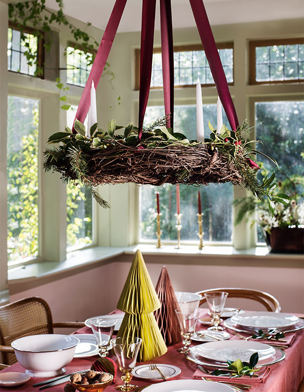 Switch up holiday decorating by choosing an unexpected signature colour to tie a dining table together. A rosy plum hue is used for the wreath ribbon, linens and folding paper decorations.
