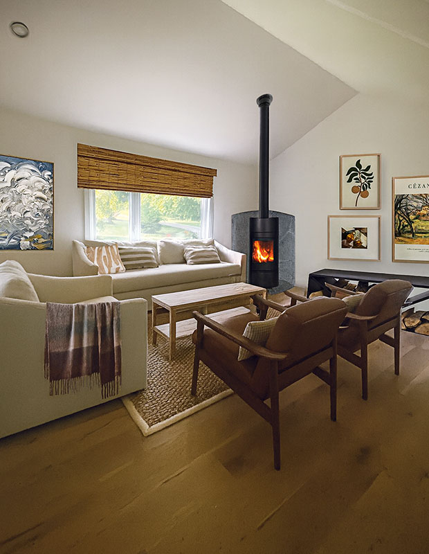 A: Great work — the room feels fresh and welcoming. Consider tucking a new fireplace into the corner near the window. Choose a slim, modern, cylindrical wood burning stove like the one shown. Check the building codes for your location but, generally, you need to install a noncombustible material directly behind the unit, as well as a stone underneath that extends 18 inches in front and eight inches to the sides and back. Try using a simple soapstone slab as a hearth and round the edges to create a pie shape that mimics the curve of the stove so it fits nicely in the corner.
