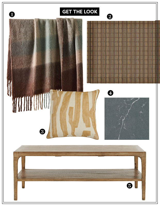 1. Faux Mohair–framed Ombré throw in Bordeaux, $119. West Elm. 2. Premium Plus Woven Wood-bamboo shades in Tortoise Cocoa, from $157. Select Blinds Canada. 3. Intargia throw pillow in Bronze, $395. Elte. 4. Silestone Eternal Charcoal soapstone, pricing upon request. Cosentino. 5. Dundas Reclaimed Wood coffee table in Hughes Ale, $899. Urban Barn.