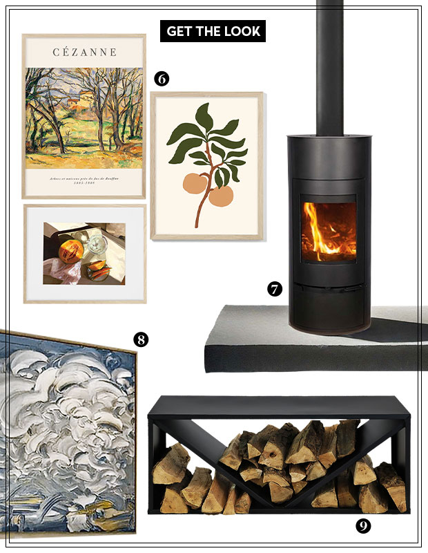 6. Fun Living Room framed poster set, $268. Opposite Wall. 7. Cylindrical Family Wood-burning fireplace by Hart Enjoy Life, $5,900. Wayfair Canada. 8. 37½” sq. Costal Currents #56 framed painting by Shane Norrie, $2,225. Wills & Prior. 9. Khamira Powder-coated Steel Firewood log rack by Latitude Run, $840. Wayfair Canada.