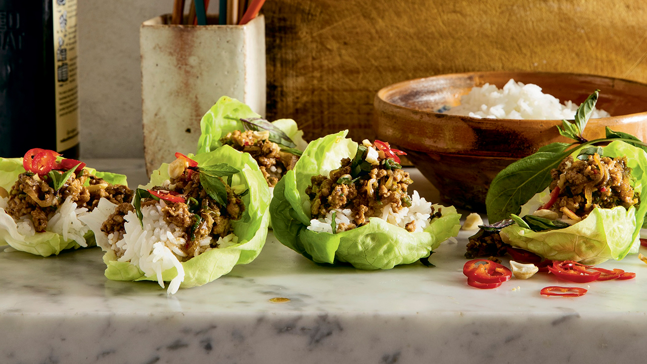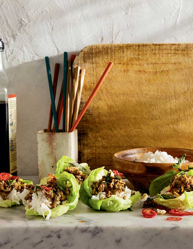 “These lettuce cups are inspired by one of my favourite Thai dishes, pad krapow gai — a spicy chicken and basil dish typically served with rice and a fried egg.” — Maxine Sharf