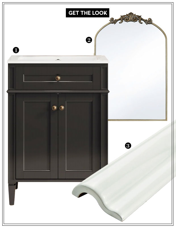 1. 24″ Dayan Freestanding Mid-century Modern Bathroom vanity with Ceramic Sink in Black by Charlton Home, $750. Wayfair Canada. 2. Voijin Recessed Framed Metal medicine cabinet in Antique Silver by Winston Porter, $440. Wayfair Canada. 3. 8″ Santorini Ceramic Chair Rail tile trim in Blanco by Merola Tile, $35 each. Wayfair Canada.