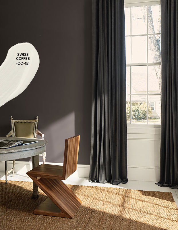 Silhouette is a burnt umber you can use to drench a space or pair with other colours, like Swiss Coffee (OC-45). “Everything shines against it,” says Andrea. “It’s like wrapping yourself in a blanket, and it creates a relationship with textural fabrics like bouclé and woven rugs.”