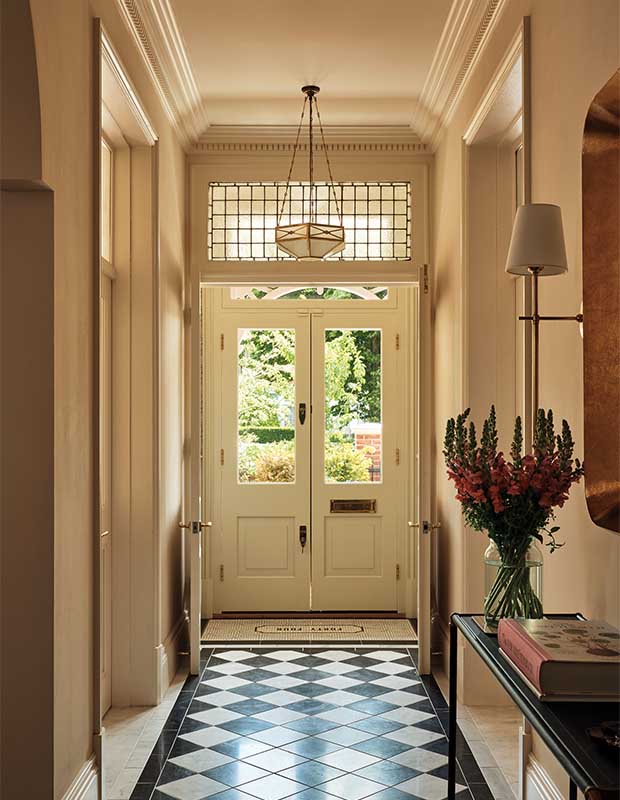 The finishes that add richness to this London home include ceiling medallions, plaster cornices, cast brass hardware, interior glazing and, underfoot, checkered floors and zippy parquet.