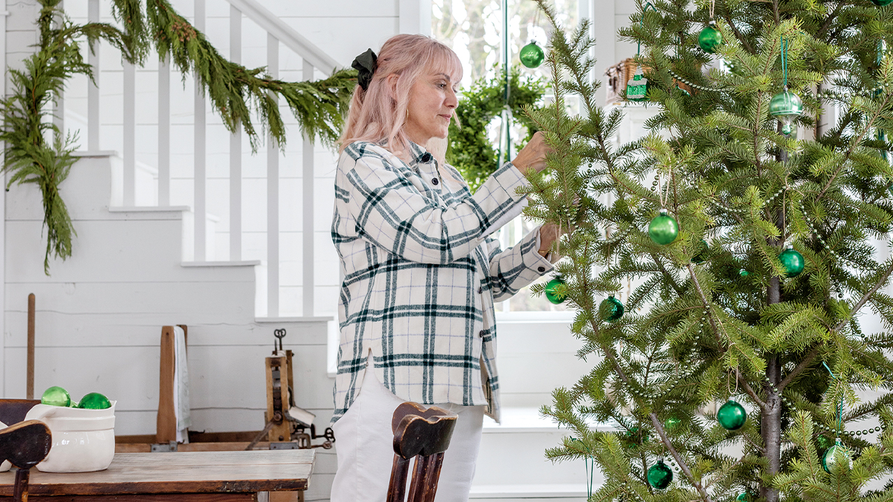 Homeowner CeCe Krecsy decorates the tree in her B.C. barn with vintage green glass ornaments suspended by twine, instead of hooks. “Fresh greenery takes you back to another time, when decorating was more natural and organic,” says Stephanie Geisbrecht, who consulted on the design of this barn. In an all-white backdrop, the pretty tree, wreaths, and branches pop and add vibrancy and life. “Evergreen boughs placed in water are long-lasting and have a festive aroma,” notes owner CeCeKrecsy.