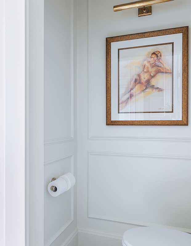 Water closets are often overlooked, so Elisia took care to outfit hers elegantly. She introduced soft lighting, the same panel moulding used in the main space and statement art painted by her late aunt Lori Fast. “It just makes this tiny space feel special,” she says.