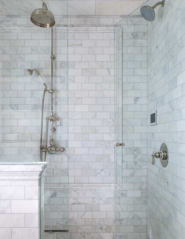 Despite the shower’s modern functionality, the look is suitably traditional: marble subway tile clads the walls and heritage-style fixtures have a polished nickel finish that will develop a lovely patina over time.