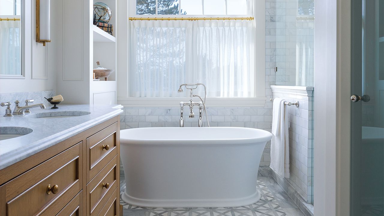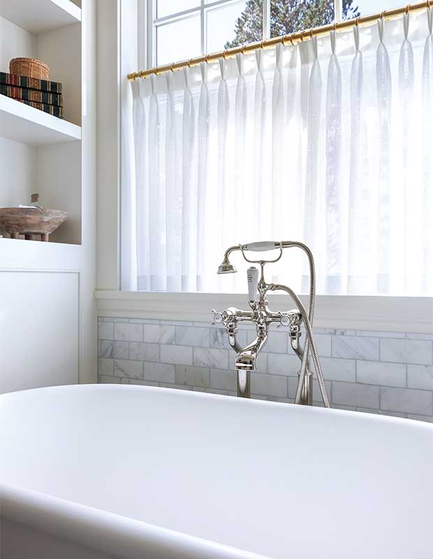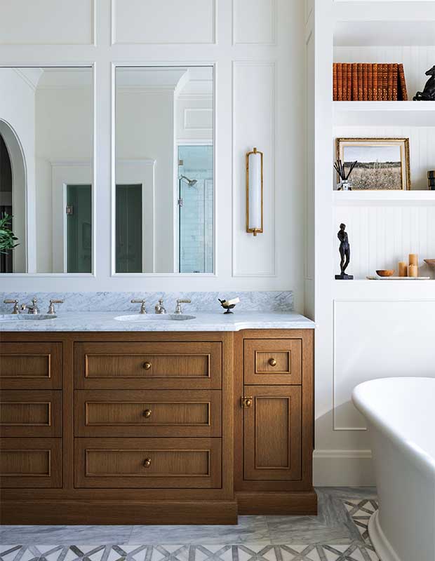 She added layers of sophistication with classic panelling and crown moulding, and brought in marble counters and tile. For the vanity, she designed a custom piece that looks like an antique dresser, with a warm finish and handmade burnished brass knobs. “We used a furniture base instead of a toekick,” she says. “And Drew and I are quite tall, so we made it higher than a standard vanity.”