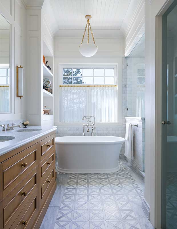 When Designer Elisia Nanos of Ivyhouse Design and her husband, Drew, saw this classic East Coast– style home for sale, they had to have it. Located in their existing Victoria neighbourhood, the property was situated right on the water. It had a timeless exterior they loved, but unfortunately, the interiors were stuck in the early 2000s. “The ensuite was dated and needed a revival,” says Elisia. “We wanted to go all in on the details and give it a true traditional look.”
