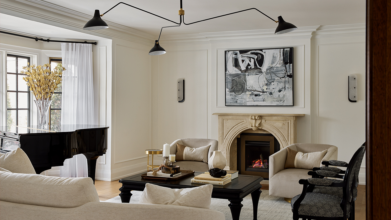 A traditional black mantel brings a piece of the past to this luxe living room by Jennifer Kominek