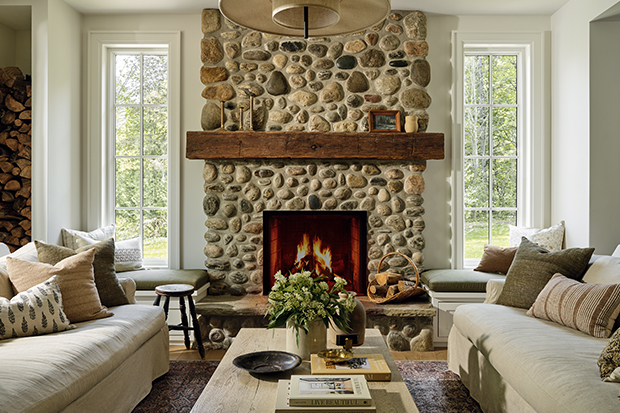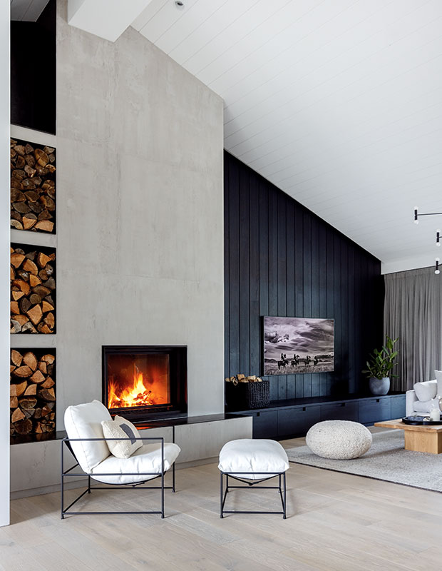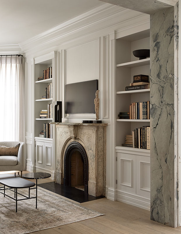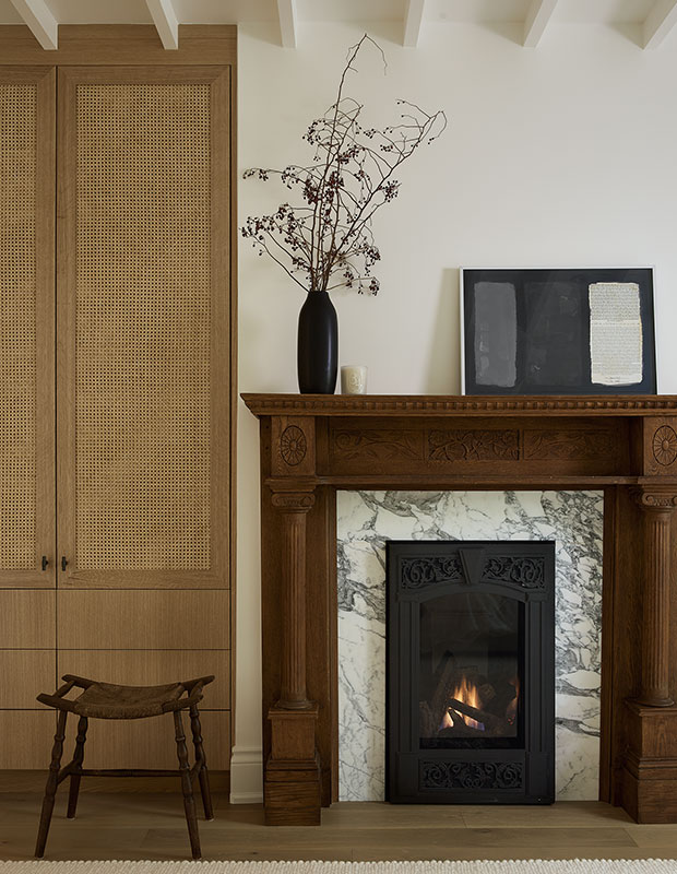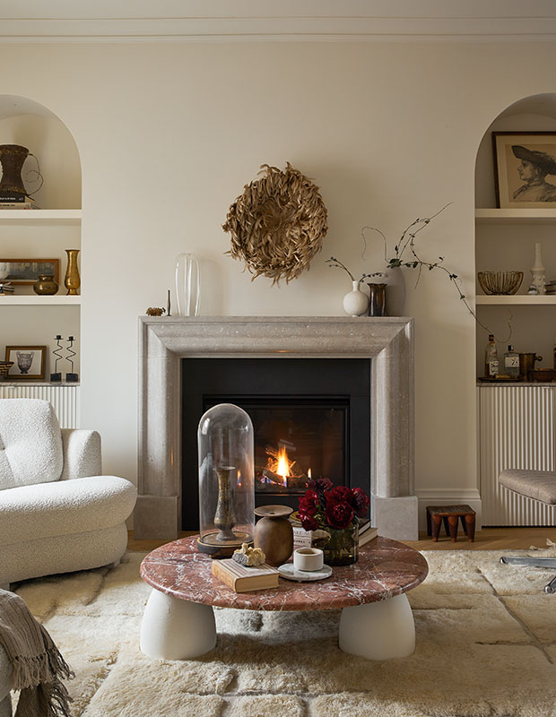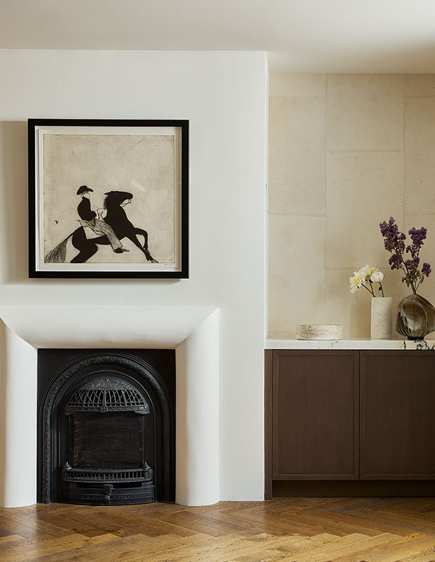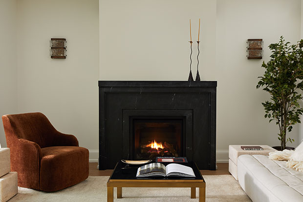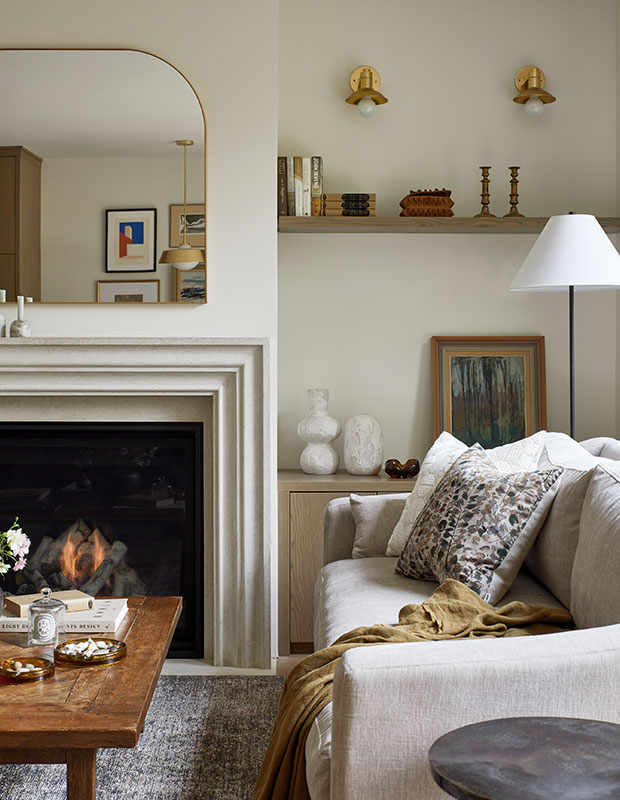 This designer wanted to keep the double-sided fireplace simple, so she opted for a microcement finish on the chimney breast and a limestone mantelpiece.