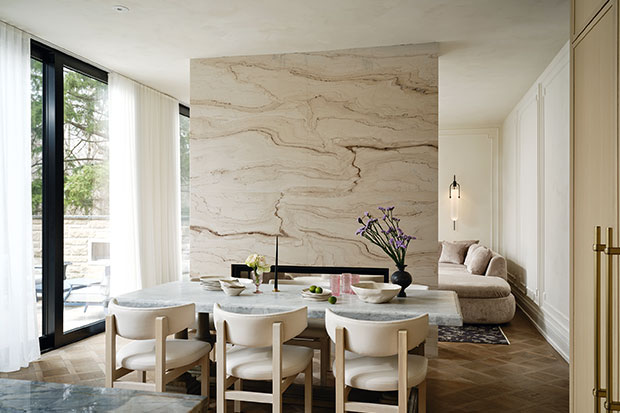 A slab of Palissandro Rosa marble with an inset double-sided fireplace divides this casual eating area from the family room.