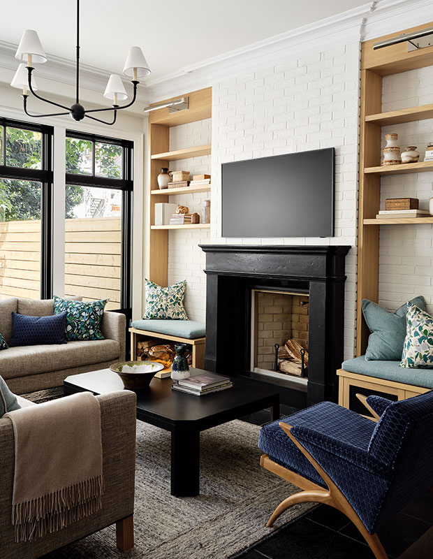 “The new fireplace in the family room was a favourite feature,” says designer Darcy Hanna. “It was fun to inject a vintage feel with brick veneer tile made on the West Coast.”