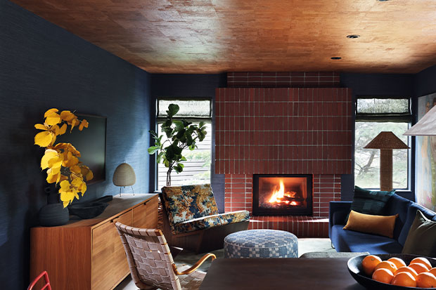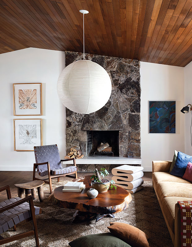 In the bright living room, designer Tiffany Leigh removed a bulkhead and borrowed stone from the exterior to extend the chimney breast to the ceiling. “The room gets lots of natural sunlight, but has a cozy cabin vibe,” she says