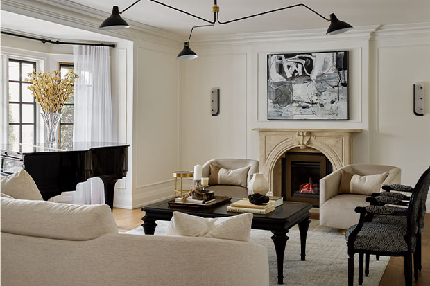 A traditional black mantel brings a piece of the past to this luxe living room by Jennifer Kominek