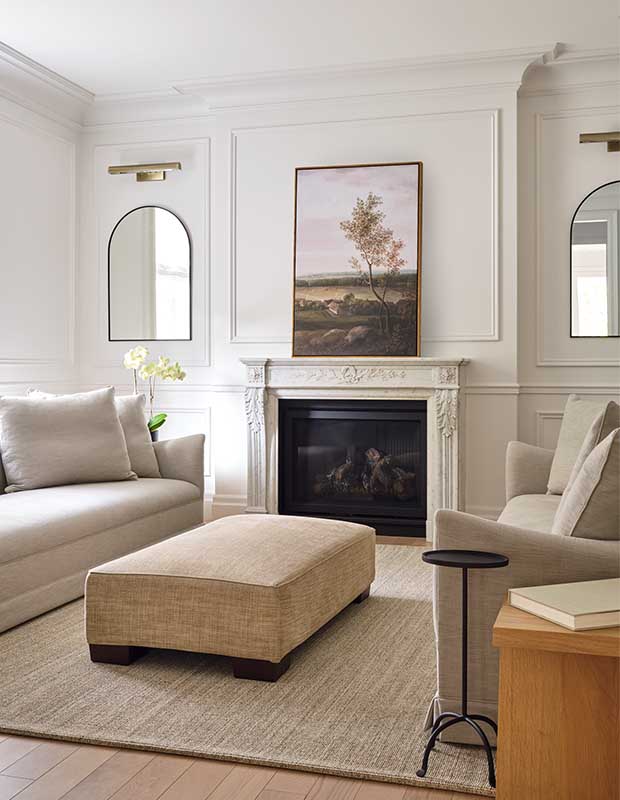 The fluting on this marble fireplace was inspired by the Four Seasons Hotel in Surfside, Fla. “There’s a vibrant green fluted marble bar with a brass top there,” says Sharon Mimran. “When I saw it, I knew I had to have something similar in my home.”
