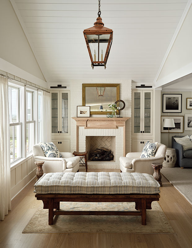 “We liked that the mantel was a light, unpainted wood that felt coastal,” says designer Lindsay Mens, “and we loved that it was a found antique from The Door Store, one of our favorite dealers in Toronto.”