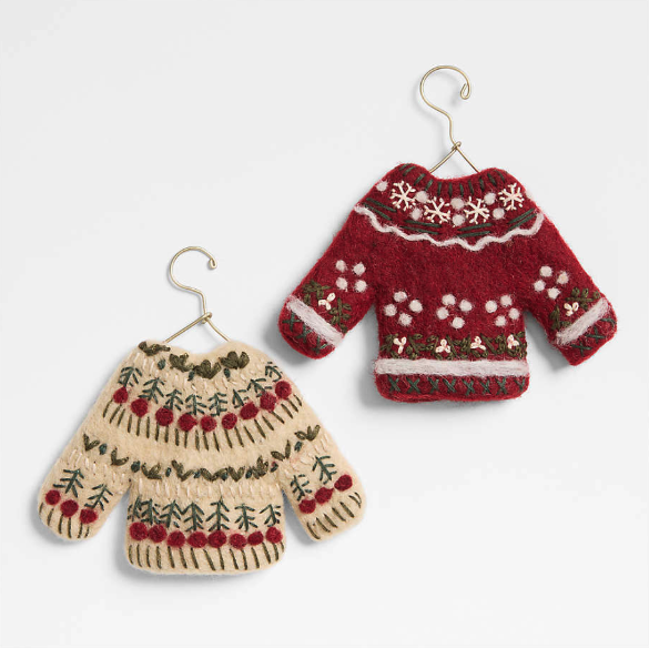 These felted, Fair Isle jumpers are hand-sewn and made of wool. Hung on a small steel hanger and available in two different colours, these Christmas sweater ornaments are a witty holiday addition for any tree — or gift!