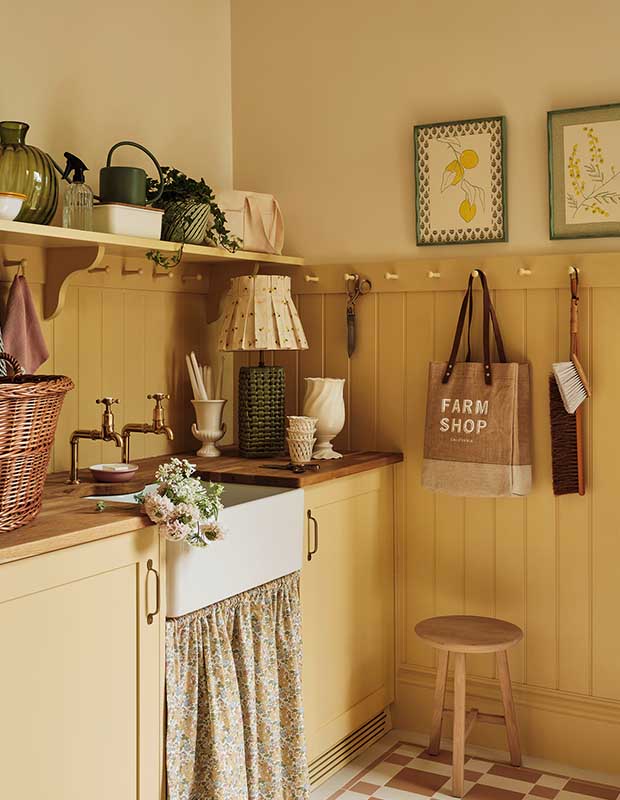 This charming laundry room boasts creamy yellow beadboard panelling and fetching terracotta- and pink-hued floor tile. “Even the usually mundane laundry room feels special. “I wanted to bring cheer to domestic tasks,” says designer Elizabeth Macfarlane.