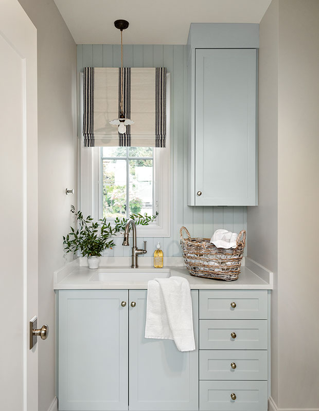 The laundry room in this West Vancouver house by designer Vania Pecchia is fresh in pale blue, amping up its French country style.