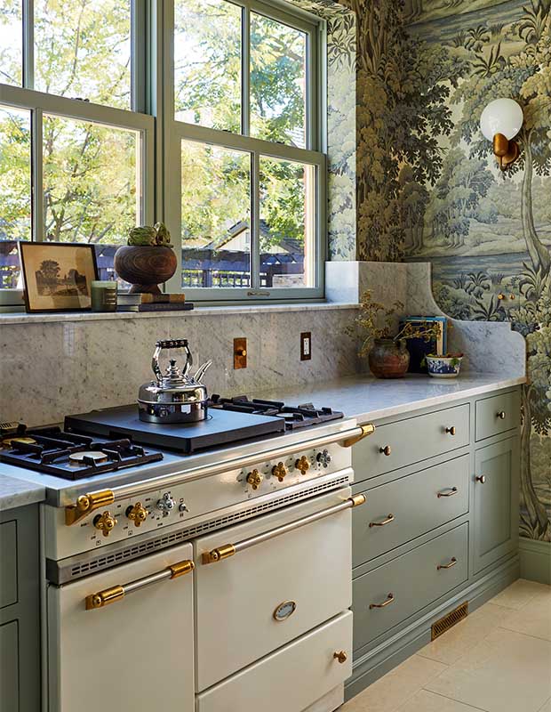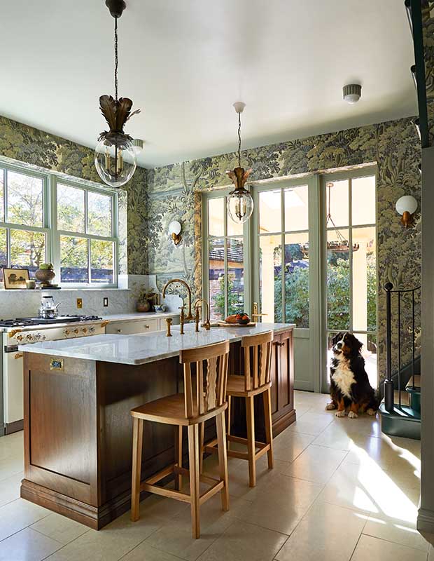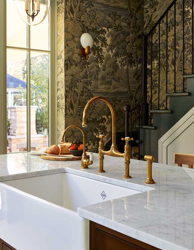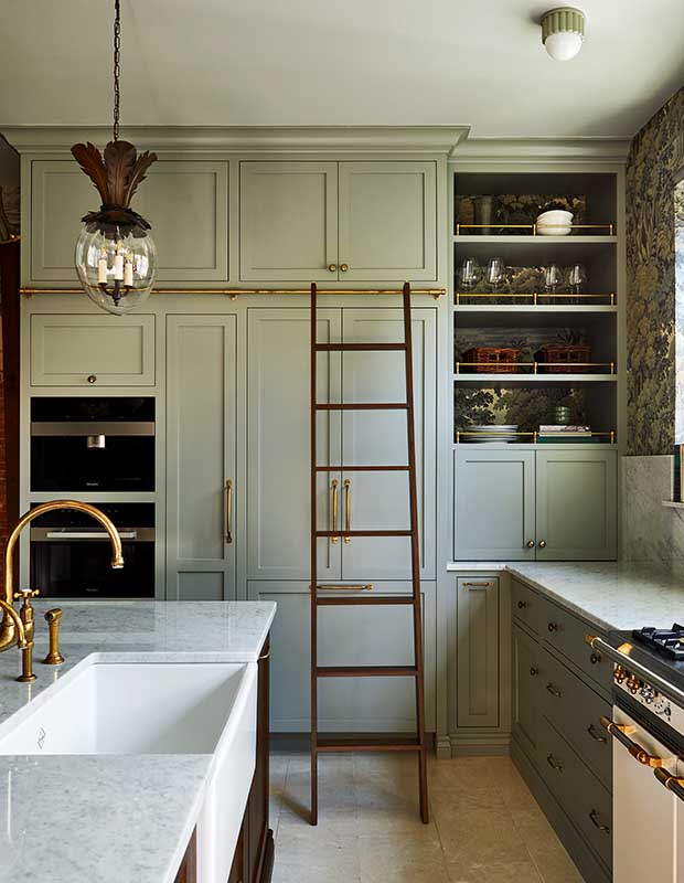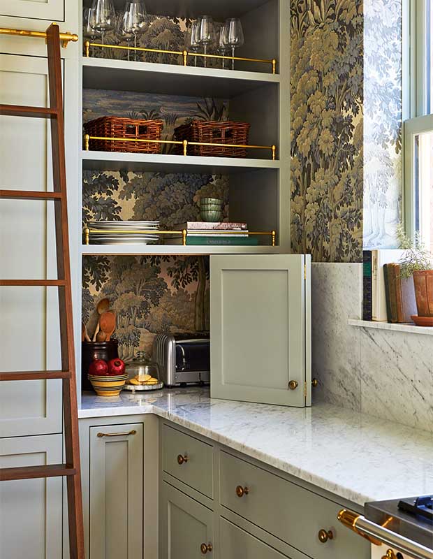 Practicality is also key in this kitchen. The windowsill doubles as a shallow display shelf, a sliding library ladder is anchored by a handsome brass rail to access high cabinets, and brass gallery rails secure dishes on open shelving (also backed in wallpaper). “I’m very inspired by historical designs that are both functional and beautiful,” says Emily. “If you can add detail or something beautiful to make a special vignette in a kitchen, I think that’s important.”
