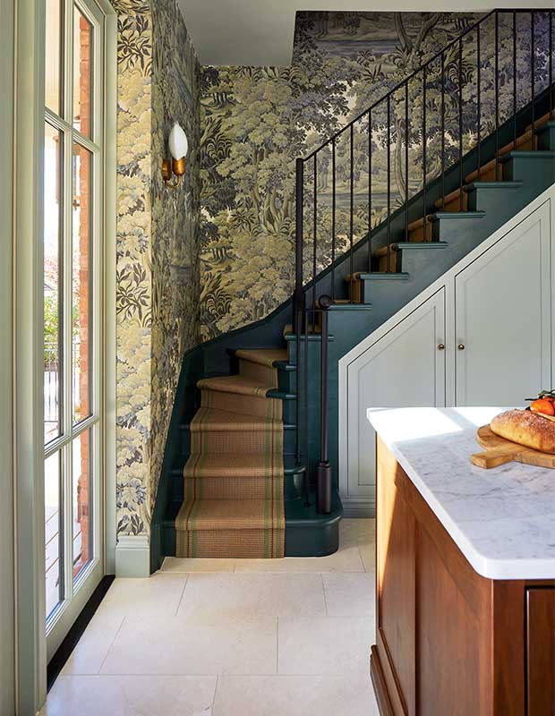 The walls of the formerly sealed-off staircase are now wrapped in charming scenic wallpaper.