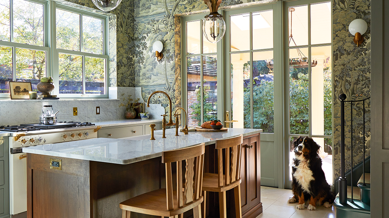 “I like mixing colours and textures — not everything needs to match.” Here, a scenic forest wallpaper full of swirling greens envelops the room, grounded by cabinets painted a mushroom hue. “The kitchen is a beautiful backdrop to the nature outdoors,” says Emily. “I love connecting the two spaces using wallpaper.”