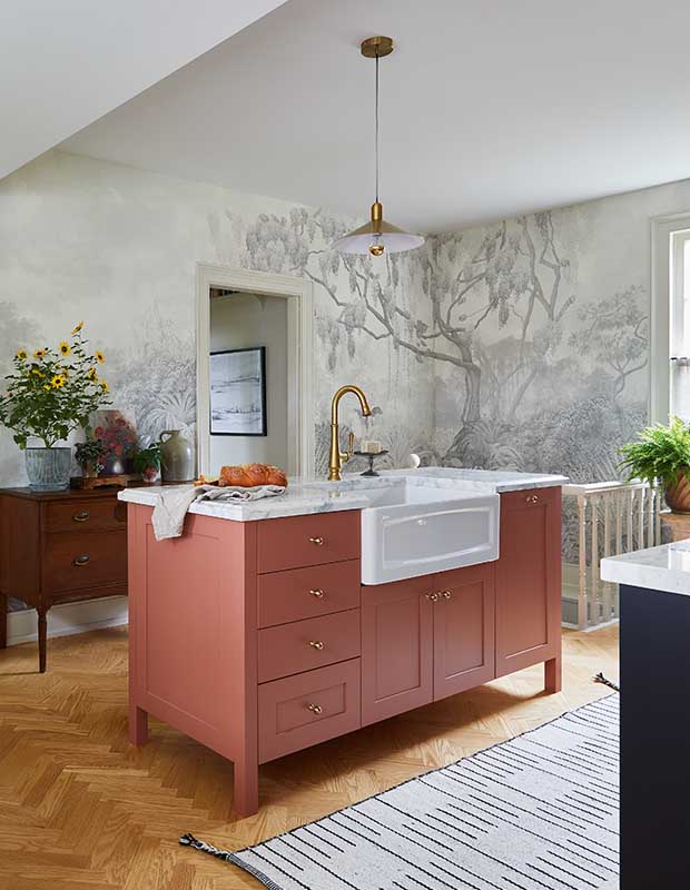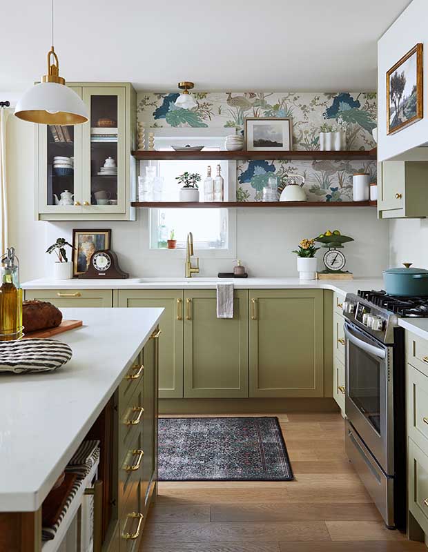 Instead of painting the walls above this backsplash white, desigenr Brian McCourt opted for a pop of wallpaper that brought the green cabinets below to life. “Small budgets don’t usually have room for high-end wallpaper; we used it sparingly and the pattern pulled the whole look together, so it was well worth it,” says Brian.