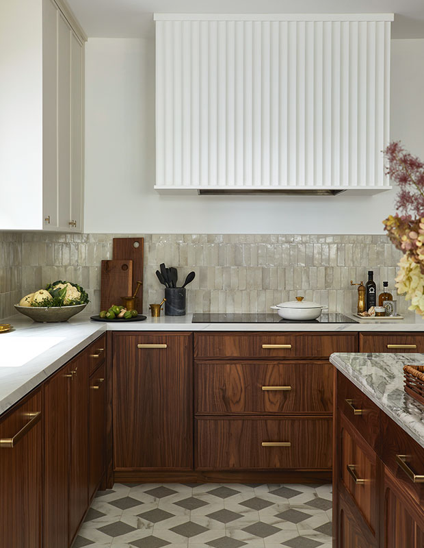 Textural elements like a fluted vent hood is a great way to add visual interest to a kitchen. In this kitchen designed by Dart Studio, the fluted vent hood also nods to the slim, Shaker-style profile of the cabinet doors.