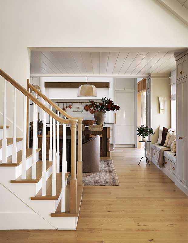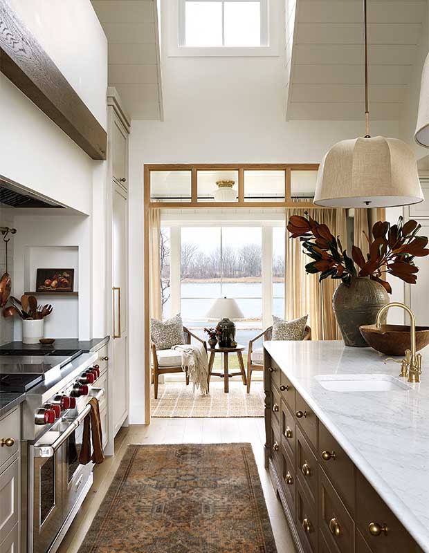 The first order of business was to raise the kitchen ceiling to 17 feet, which opened up the space significantly. Audrée infused the house, including the kitchen and adjacent living areas, with neutral hues, natural materials and vintage layers. “My first thought was, How can we add warmth to this kitchen and give it more life?” says Audrée.