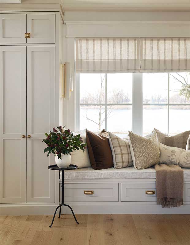 In the adjoining dining area, a picture window offered Audrée a spot to create a window seat layered in colour and textiles, which is flanked by a pantry and coat closet. “This adds more space to sit and enjoy the view,” she says. And that’s really what this kitchen is all about — finding different spots to sit and watch the river flow.