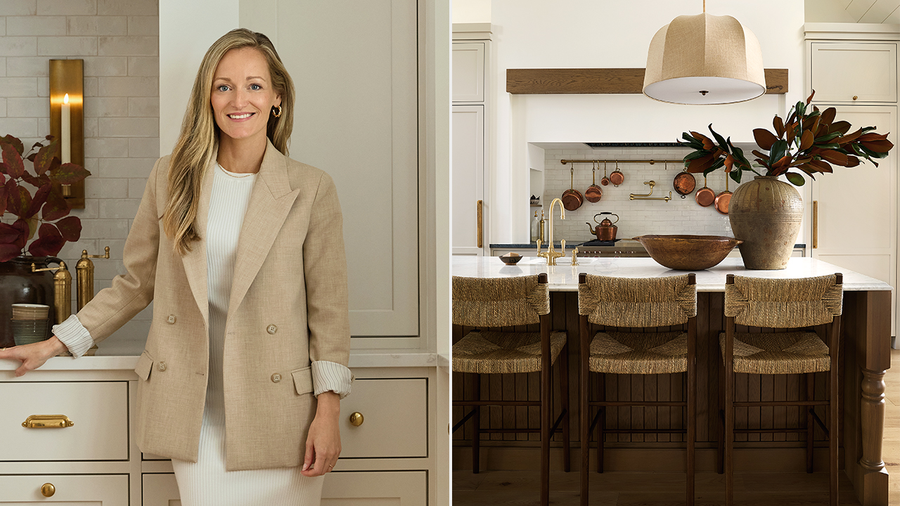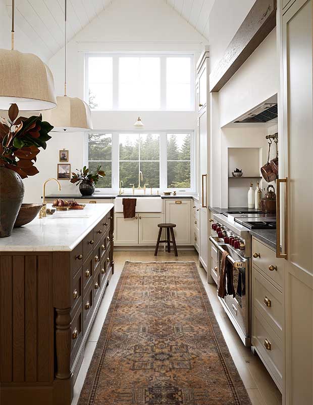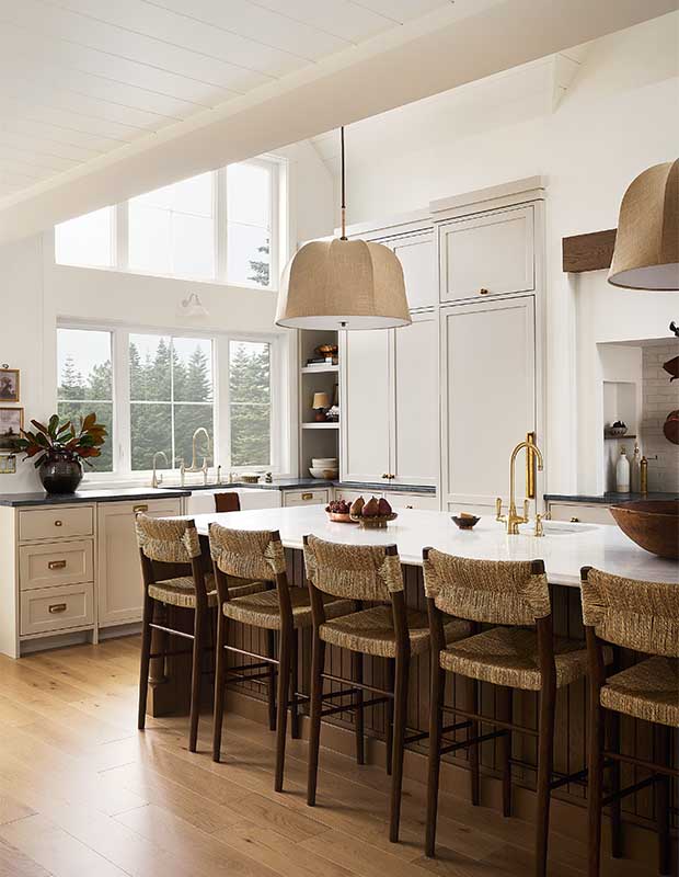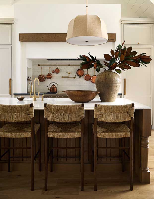 To bring warmth to the space, Audrée used her signature natural materials, including white oak in multiple hues for the floor, island, vent hood beam and transom window. Tactile elements such as the soapstone and Bianco Carrara marble counters, barstools dressed in seagrass and linen pendants finish the look. Vintage-look tile, and a brass pot filler and pot rail in the deep cooking nook also add a hit of character