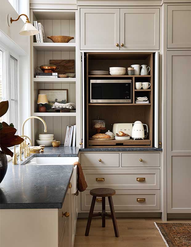 Audrée added a small section of open shelving that’s backed in shiplap to match the ceiling. The coffee nook doors can be left open for guests to help themselves or closed when it’s not in use. She camouflaged the appliances behind soft grey panels to match the modified Shaker-style cabinets. “The cabinet shade is luminous and a bit moody; it’s the perfect colour to warm up the space,” says Audrée.