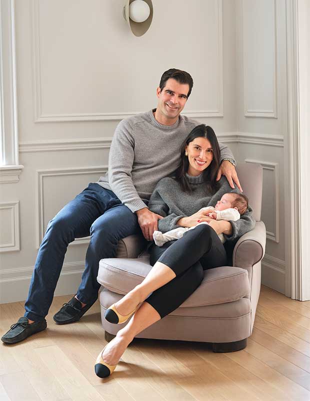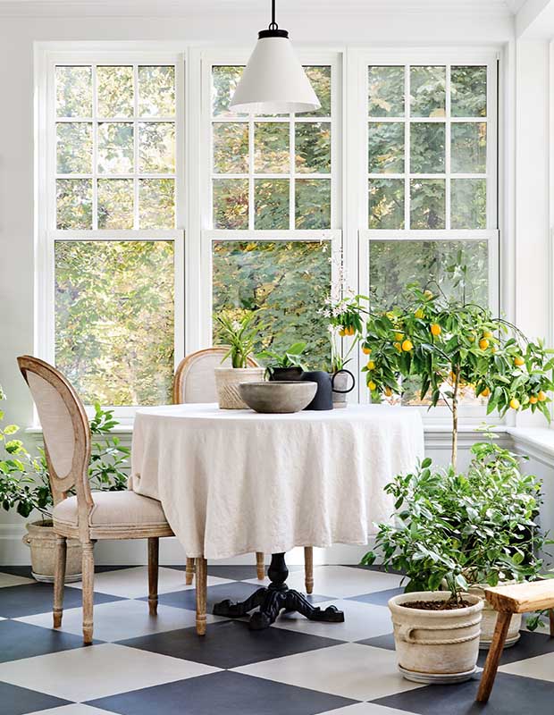 One of the standout design moments is the couple’s sunroom inspired by an Italian limonaia. While visiting Italy one January, the couple discovered the delightful greenhouse room used to shelter lemon and other citrus trees. “We later got married in a limonaia, so we decided to create a small version of our own for growing citrus indoors and escaping our snowy Montreal winters,” says Stephanie. Entering through French doors, the sunny space has classic mullion windows and charming checkered floors. “This is my favourite room for morning coffee, reading and playtime with our son; the natural light is beautiful.” She also paints here (the nursery mural is her handiwork, a nod to the frescoes that adorn the walls and ceilings of many a palazzo). “We love the understated European feeling that Martha created,” says Stephanie. It’s the next best thing to a vacation abroad.
