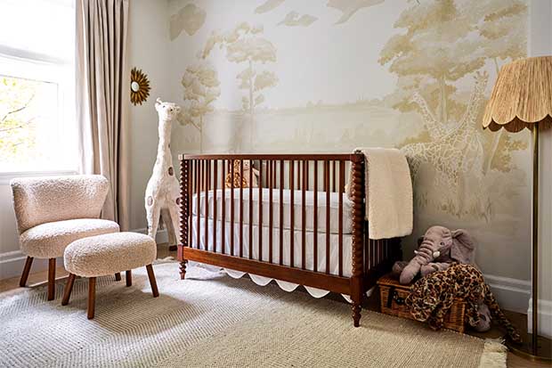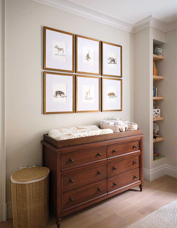 A classic wood dresser, animal-themed art and built-in cubbies are ideal for a nursery.