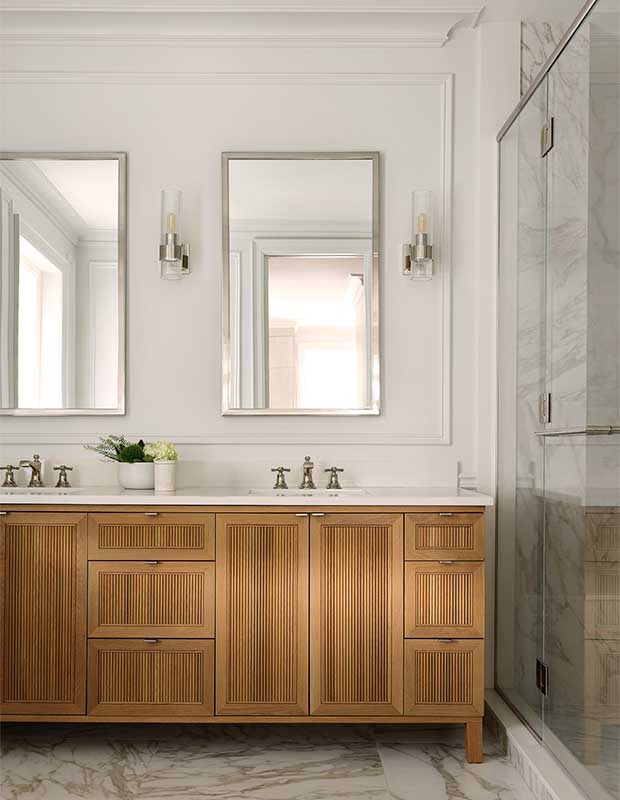 The ensuite’s white oak vanity with reeded doors add warmth.
