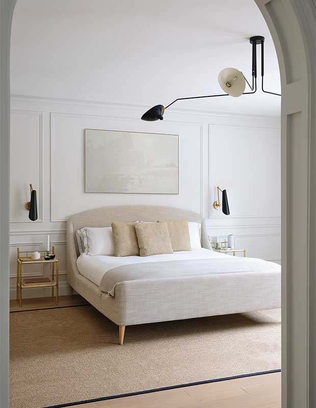The principal bedroom gets a French twist with a Serge Mouille ceiling fixture and vintage nightstands from Marseille.