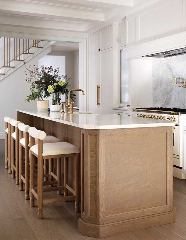 The backsplash and white oak island’s marble counter have timeless style.