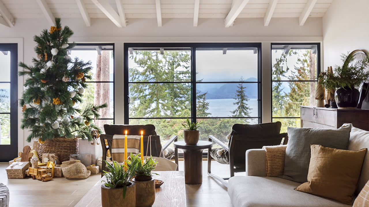 In this mountainside bungalow in Lion’s Bay, B.C., holiday decorations take their cue from pints outside. A Scotch pine is set in a large basket and simple ornaments.