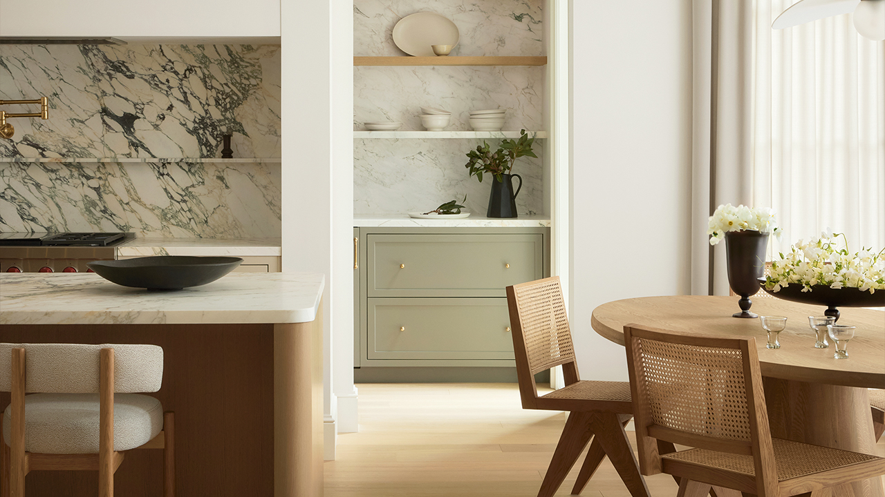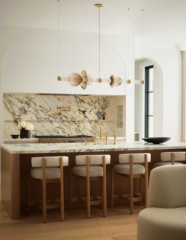 A heavily veined Calacatta Monet backsplash brings energy to the kitchen.