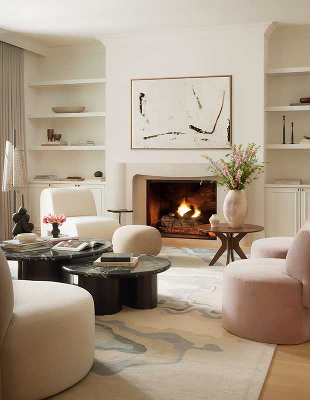 Furniture was chosen for its sculptural appeal — boxy kitchen chairs are a nod to Parisian design, and the family room’s custom bouclé lounge chair was inspired by the retro aesthetic of the 1950s.